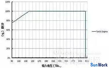 因此,如圖 2 當(dāng)輸入電壓小于 140Vac 時(shí),要求驅(qū)動(dòng)器的輸出負(fù)載隨輸入電壓減小而線性減小??炊缟辖殿~曲線及相應(yīng)要求后,選用 LED 驅(qū)動(dòng)器時(shí)就應(yīng)該根據(jù)實(shí)際使用時(shí)的環(huán)境溫度情況及輸入電壓情況,綜合考慮及選擇,并適當(dāng)留出降額余量。