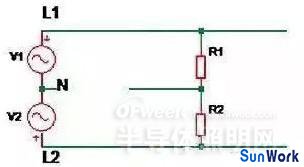 如上圖所示,V1 表示第一相電壓,V2表示第二相電壓,R1 及 R2 分別表示正常安裝到線路中的 LED 驅(qū)動(dòng)器。當(dāng)線路上零線(N)如圖斷開時(shí),兩個(gè)支路上的驅(qū)動(dòng)器 R1,R2 相當(dāng)于串聯(lián)后接到 380Vac 電壓上。因?yàn)檩斎雰?nèi)阻差異,當(dāng)其中一個(gè)驅(qū)動(dòng)器充電到啟動(dòng)時(shí),內(nèi)阻變小,電壓可能大部分加到另外一個(gè)驅(qū)動(dòng)器上,導(dǎo)致其過壓損壞失效。