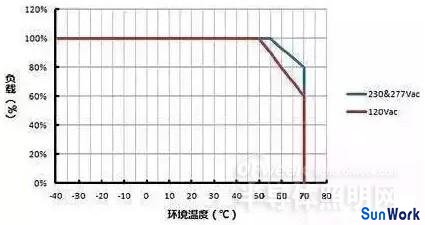 藍(lán)色曲線則表示 LED 驅(qū)動(dòng)器在輸入 230Vac 或 277Vac 情況下,其負(fù)載隨環(huán)境溫度變化的功率降額曲線,其原理類同。