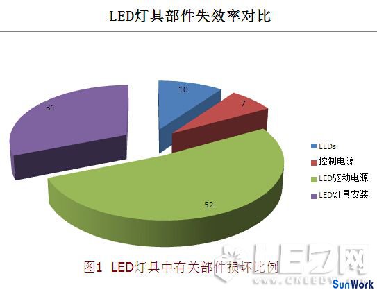 LED燈具中有關(guān)部件損壞比例如圖1所示,其中,LEDs的損壞率為10%,控制電路為7%,LED燈具的安裝為31%,LED驅(qū)動器為52%??梢娫贚ED燈具中LEDs的損壞率并不高,LED驅(qū)動電路失效率相對較高為52%,LED燈具失效90%并非來自LED(數(shù)據(jù)來源:Appalachian Lighting Systems)。該數(shù)據(jù)的統(tǒng)計條件是在5400件LED燈具中失效燈具為29具(失效率為:0.54%)的實驗條件下進行的。