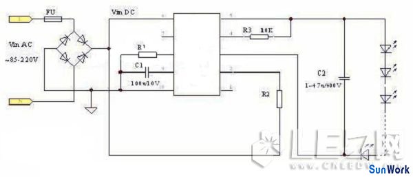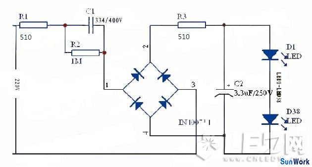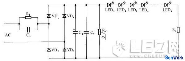 在圖中,電容C1的作用是降壓和限流;VD1~VD4的作用是整流,用于將交流電整VD1~VD4可選擇1N4007系列的整流二極管。C2、C3的作用為濾 波,用于將整流后的脈動直流電壓濾波成平穩(wěn)的直流電壓。C2、C3的耐壓應根據負載電壓而定,一般為負載電壓1.2倍,其電容容量視負載電流的大小而定。壓敏電阻Rv(或瞬變電壓抑制二極管)的作用是將輸入電源中瞬間的脈沖高壓對地泄放掉,從而保護LED不被瞬間高壓擊穿。
