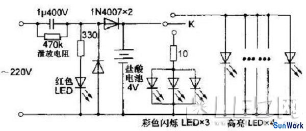 根據實物畫出的電路工作原理圖如圖所示,220V交流市電經電容降壓、二極管整流后給鉛酸蓄電池充電,紅色LED作充電指示。充好電后使用時閉合按鈕開關K,將首先接通3顆彩色閃爍LED,發(fā)出夢幻般變化莫測的七彩光芒,在夜間平添一些生活樂趣,再按一下開關K則關閉彩色閃爍LED,接著再按才會接通24顆并聯的高亮LED,由于數目較多,照明效果很好。
