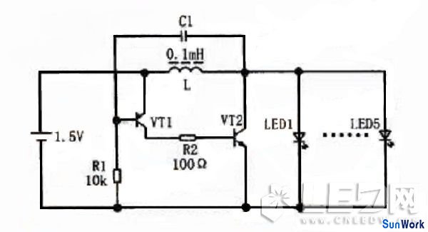 接通電源后,VT1因R1接負極,而c1兩端電壓不能突變。VT1(b)極電位低于e極,VT1導通,VT2(b)極有電流流入,VT2也導通,電流從電源正極經L、VT2(c)極到e極,流回電源負極,電源對L充電,L儲存能量,L上的自感電動勢為左正右負。經c1的反饋作用,VT1基極電位比發(fā)射極電位更低,VT1進入深度飽和狀態(tài),同時VT2也進入深度飽和狀態(tài),即Ib>Ic/β(β為放大倍數)。隨著電源對c1的充電,C1兩端電壓逐漸升高,即VTI(b)極電位逐漸上升,Ib1逐漸減小, 當Ib1<=Ic1/β時,VT1退出飽和區(qū),VT2也退出飽和區(qū),對L的充電電流減小。此時.L上的自感電動勢變?yōu)樽筘撚艺?,經c1反饋作用。VT1基極電位進一步上升,VT1迅速截止,VT2也截止,L上儲存的能量釋放,發(fā)光管上的電源電壓加到L上產生了自感電動勢,達到升壓的目的。此電壓足以使LED發(fā)光。